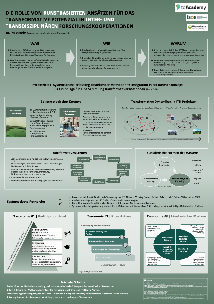 Im Rahmen der ersten Tagung der Gesellschaft für transdisziplinäre und partizipative Forschung e.V. (GTPF) hatte ich die Möglichkeit mein tdAcademy Projekt vorzustellen. Auch wenn ich die Frage danach, welche Methoden unter welchen Bedingungen möglicherweise besonders transformativ wirken (noch) nicht final beantworten kann, hat das Projekt eine wunderbare Annäherung an die komplexe Thematik ermöglicht. Die während der Recherche entwickelten Taxomonomien könnten einen Anfang darstellen, eine Systematik in den Einsatz kunstbasierter Methoden im ITD Kontext zu generieren.